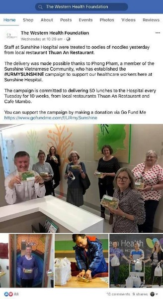 Tháng 3/2020 từ đợt dịch thứ 1 cho tới đợt dịch thứ 2 bùng phát tháng 6 ,Cộng đồng người Việt Nam tặng trên 400,000 masks , 150,000 bao tay , 20,000 mặt nạ plastic , 5000 áo chòang (tổng trị giá trên $250,000 dollars)cho bịnh viện Sunshine Melbourne và phân phát cho tòan thể đồng bào ở Victoria và các tiểu bang khác và Phân phối hằng ngàn phần ăn trưa đã và đang hiến tặng cho các bịnh viện miền tây Melbourne