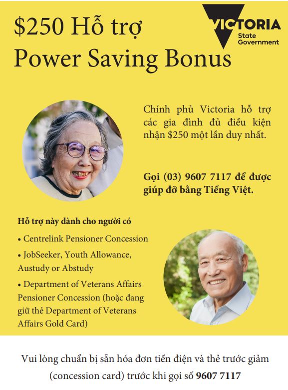 Thông tin về khoản hỗ trợ $250 Power Saving Bonus của chính phủ Victoria cho các hộ gia đình ạ. Hiện nay do lockdown nên bên Energy Info Hub đang hỗ trợ nộp hồ sơ qua điện thoại: (03) 9607 7117 – nói tiếng Việt hoặc (03) 9607 7103 – nói Tiếng Anh.