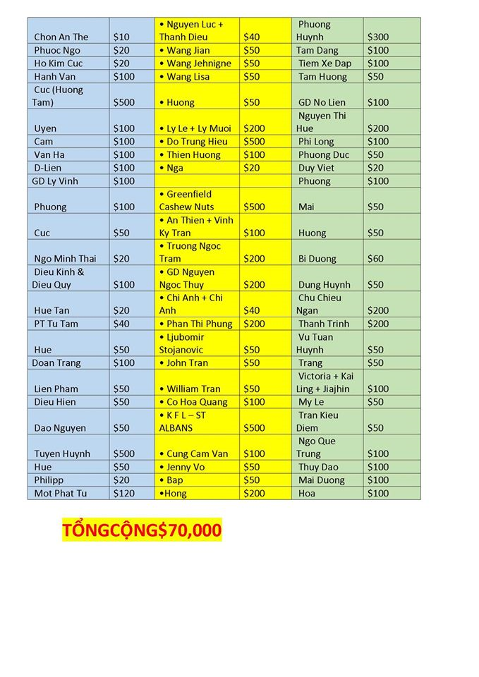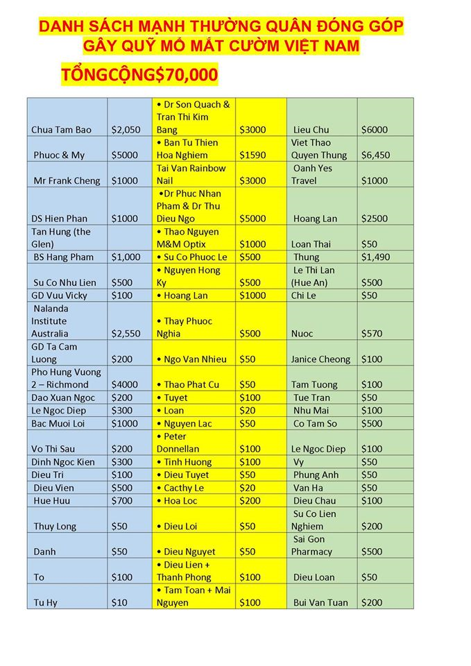 Sau khi trừ chi phí số tiền nầy sẽ cho chương trình mổ mắt từ thiện và khám bịnh ,cho quà Tỉnh Bình Phước và 6 tỉnh nam trung bộ Việt Nam ngày 16-17-18/03/2020.